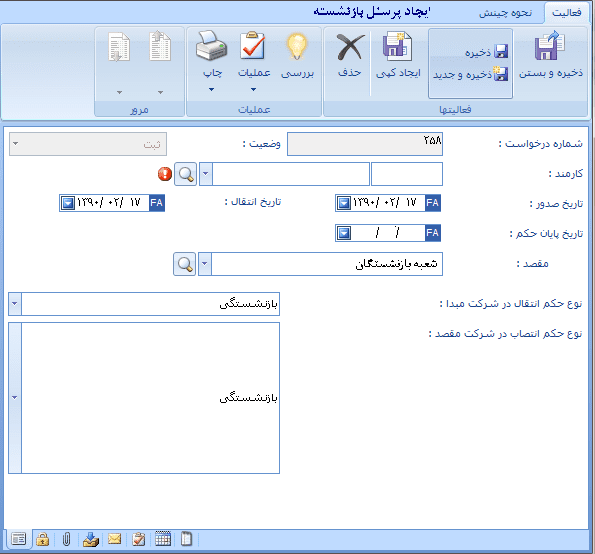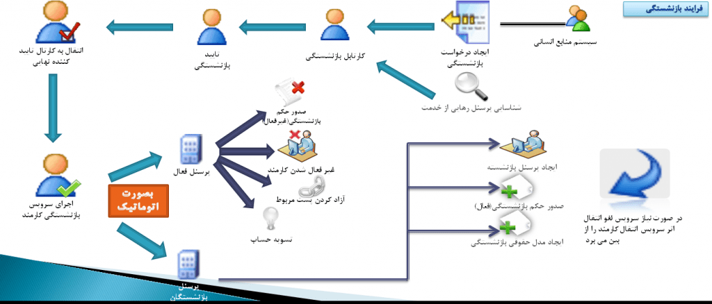 - انتقال به سیستم بازنشستگان و غیر فعالسازی پرسنل از سیستم اصلی بانک به همراه آزادسازی پست سازمانی مربوطه