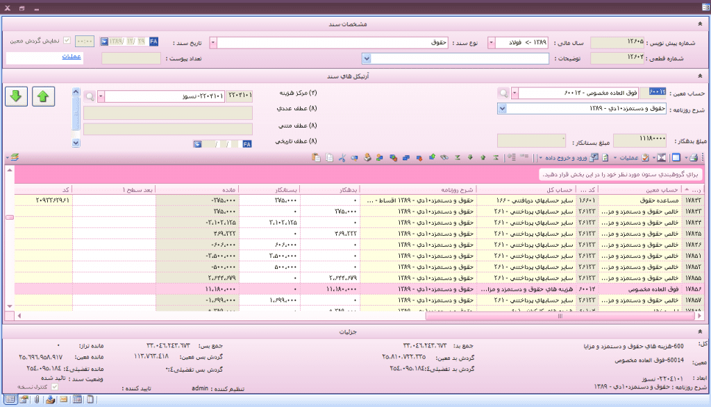 • ثبت اطلاعات سند حسابداری بصورت: یادداشت، موقت، تایید شده و قطعی