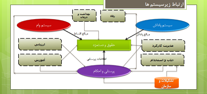 - در دیاگرام بالا با هدف نمایش نقش کلیدی سیستمهای پرسنلی، احکام و حقوق دستمزد تنها برخی از سیستمها وارتباطهای کلان بین آنها مدل شده است.