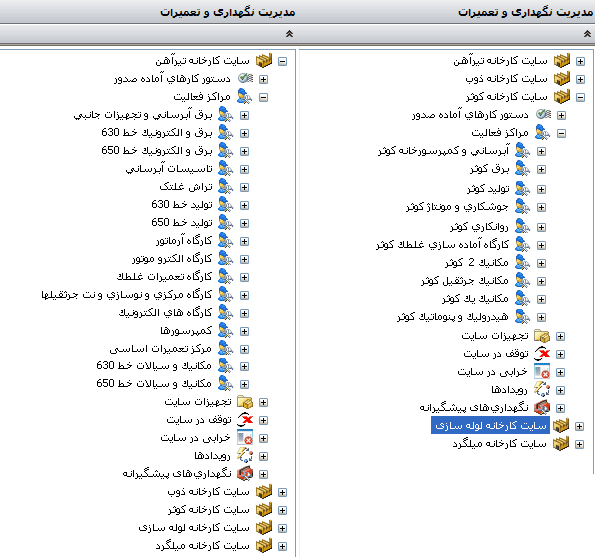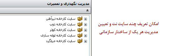 - امکان تعریف چند سایت نگهداری و تعمیرات و تخصیص مدیریت هر یک به یک واحد سازمانی از چارت سازمانی