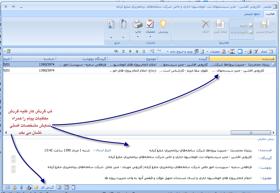 - امکان تعریف کار (Task) بر روی هر پیام و به جریان انداختن آن